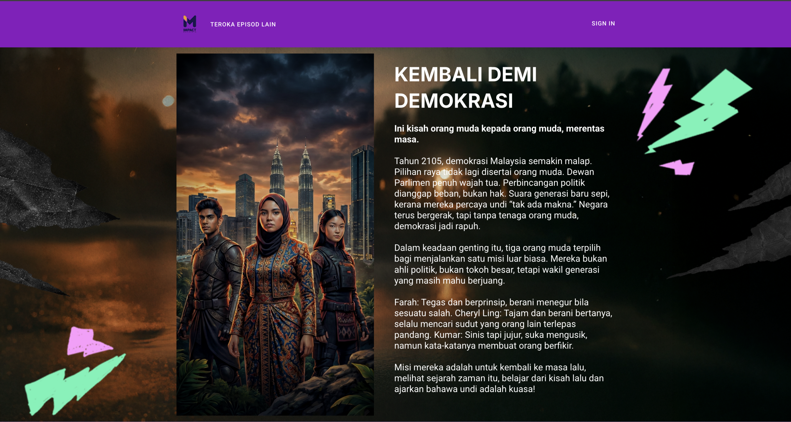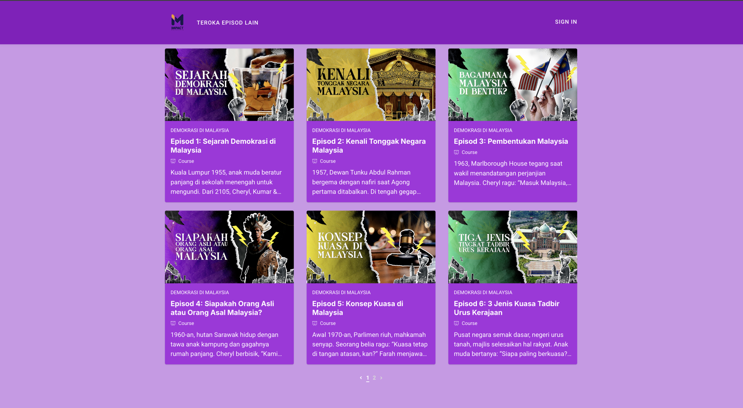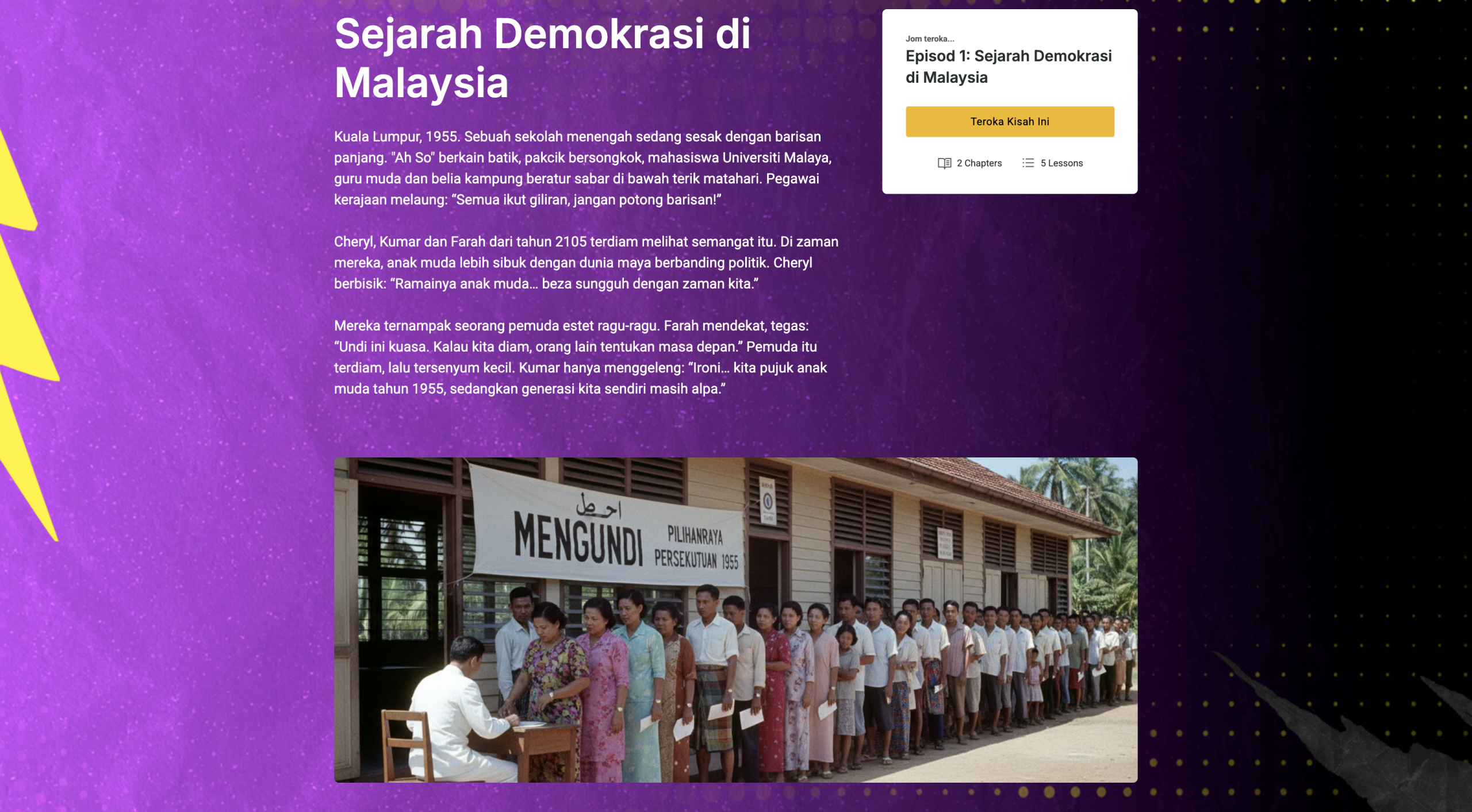 Jom faham cara Malaysia berfungsi melalui video pendek dan interaktif tentang demokrasi, pilihan raya, dan hak korang sebagai warganegara. Tonton, main, dan jawab kuiz untuk faham macam mana anak muda boleh ubah masa depan negara. Lengkapkan modul, dapatkan sijil, dan mula guna suara korang dengan yakin